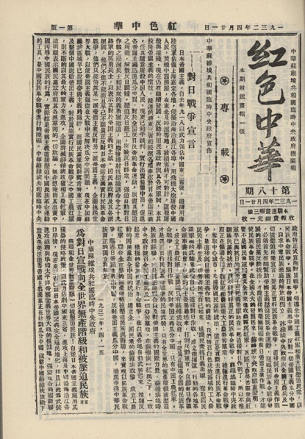 中国共产党是中国人民反抗日本军国主义侵略最早的宣传者、动员者、抗击者。早在1931年日本军国主义发动九一八事变后,中共中央和中共满洲省委就发表宣言,反对日本军国主义侵略。同年11月成立的中华苏维埃共和国临时中央政府翌年4月发布了《对日战争宣言》。中国共产党及时在东北领导和组织了抗日武装力量,对日军进行了有力抗击。